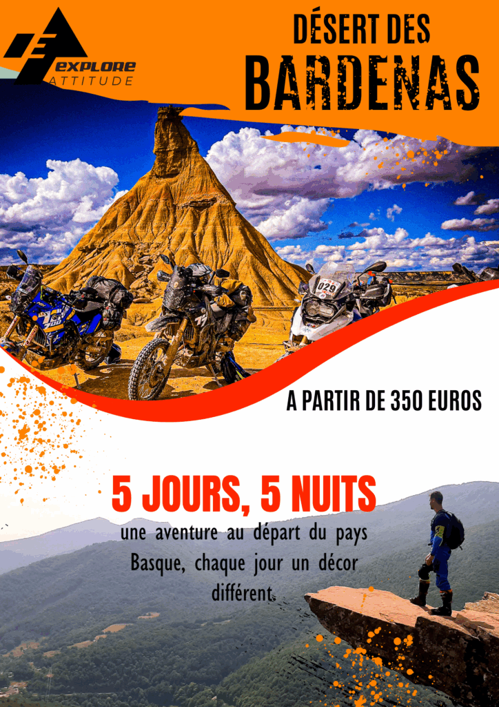 Un circuit de 5 jours et 4 nuits pour vous dépayser. Un parcours au court duquel nous allons pouvoir découvrir la compagne vallonnée et verdoyante du Pays Basque au travers de chemins et petites routes. Plus nous descendrons vers le sud et plus nous monterons en altitude. Puis nous passerons la frontière avec l’Espagne et nous engagerons sur les belles pistes arides de la région Navarre en direction du désert des Bardenas.